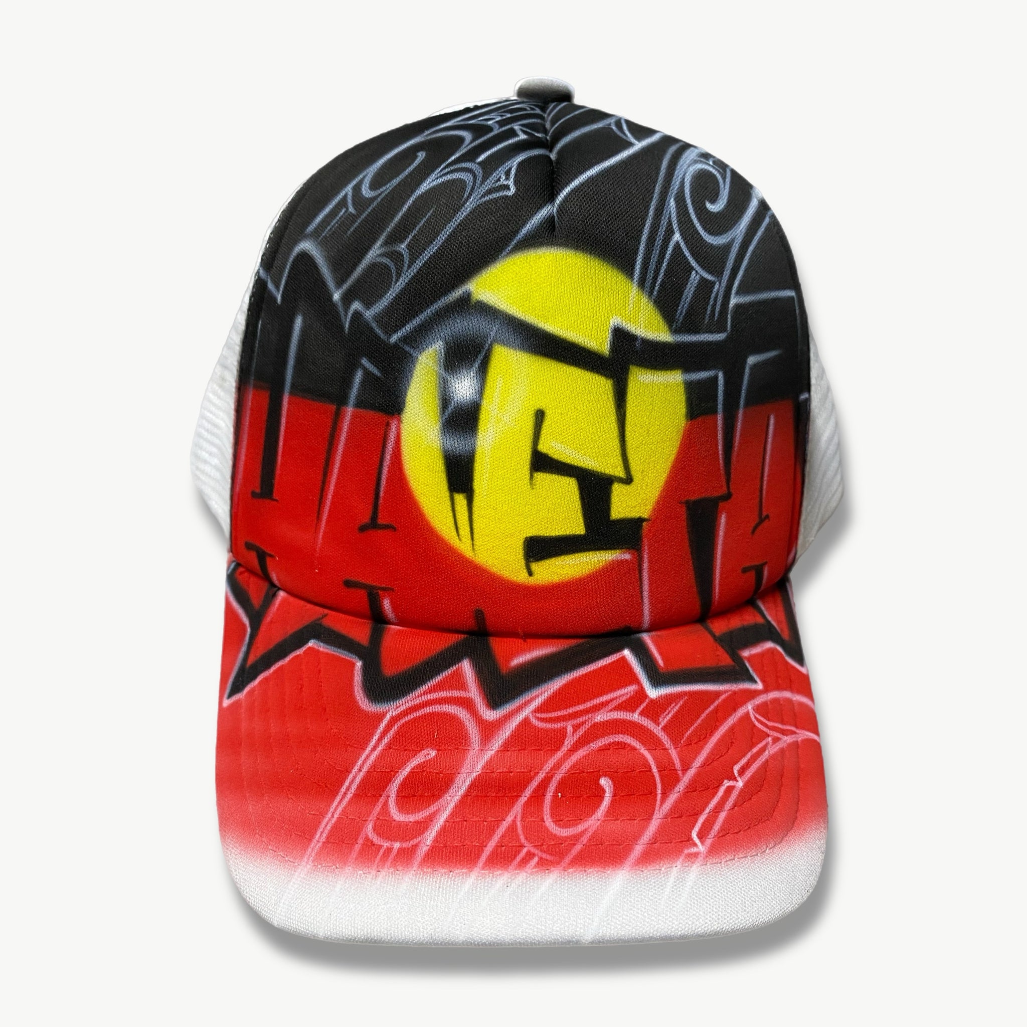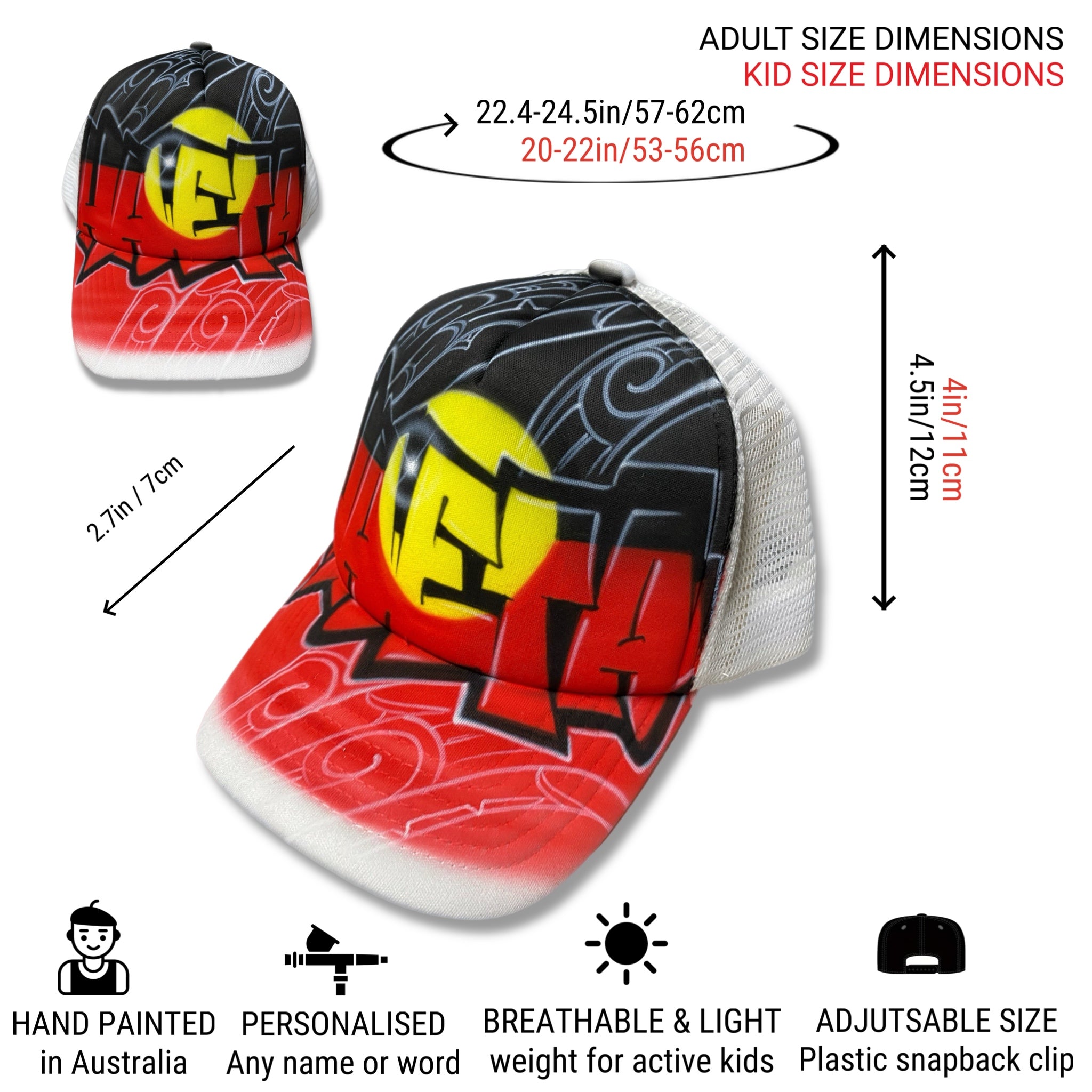 Each cap is individually painted in our studio using the exact Aboriginal Flag Design shown above. Your child's name replaces the example name in the same layout and colours.