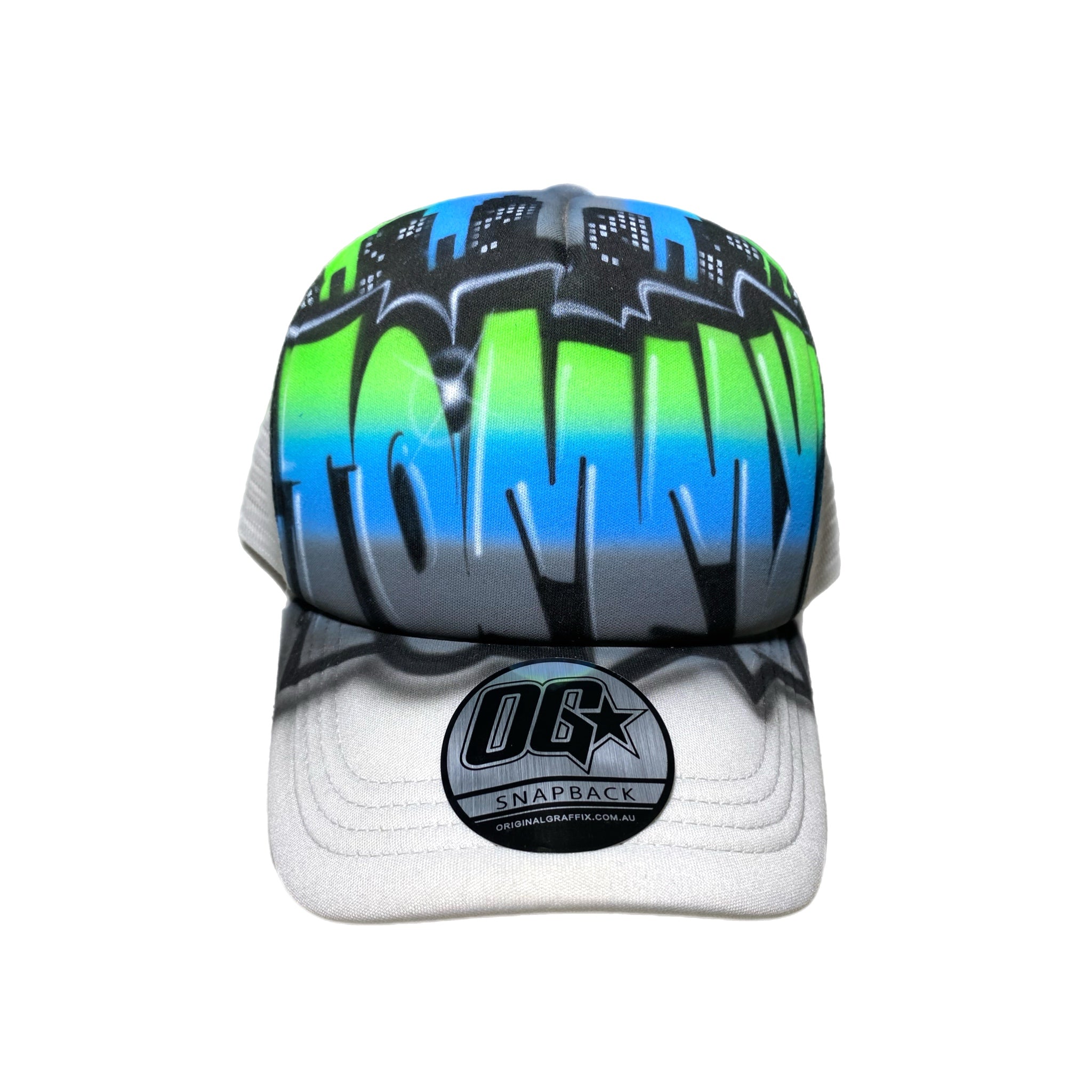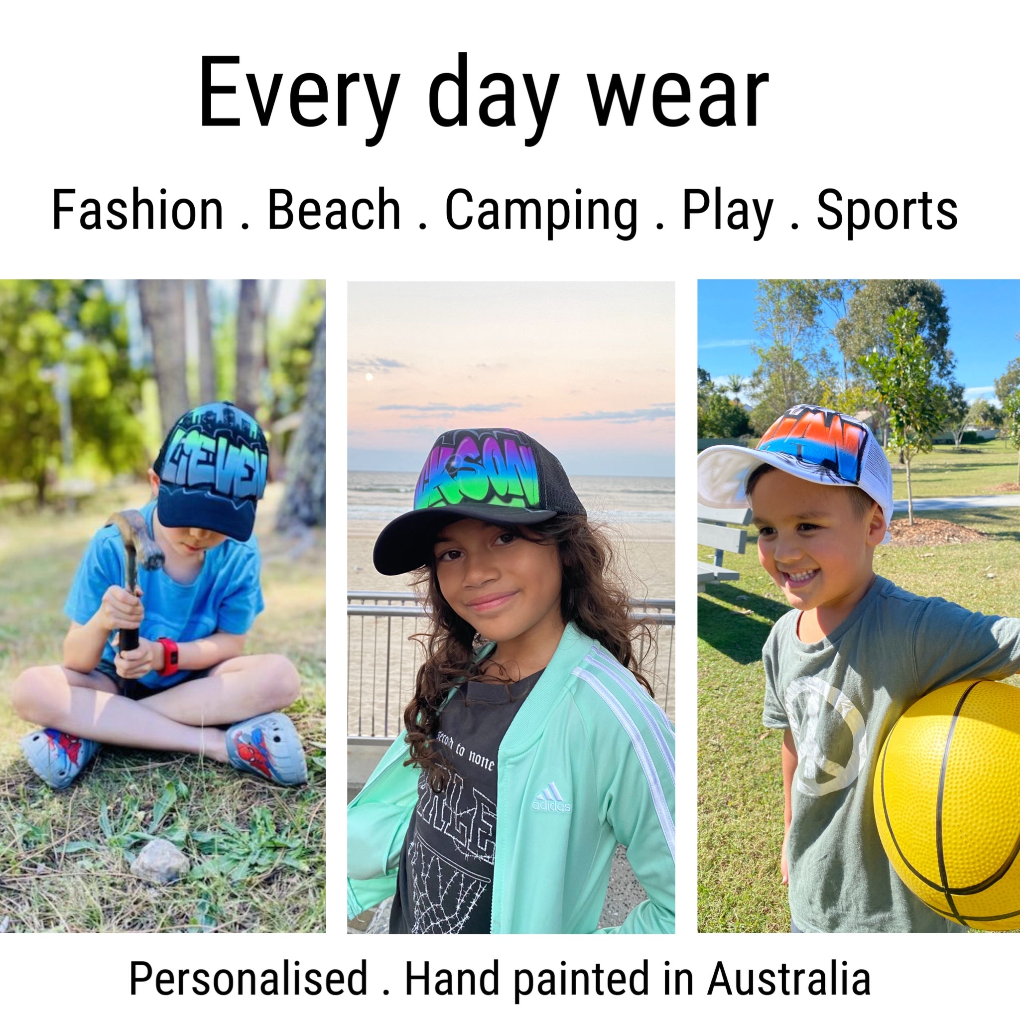 Each cap is individually painted in our studio using the exact 3 City Style shown above. Your child's name replaces the example name in the same layout and colour blend you choose.