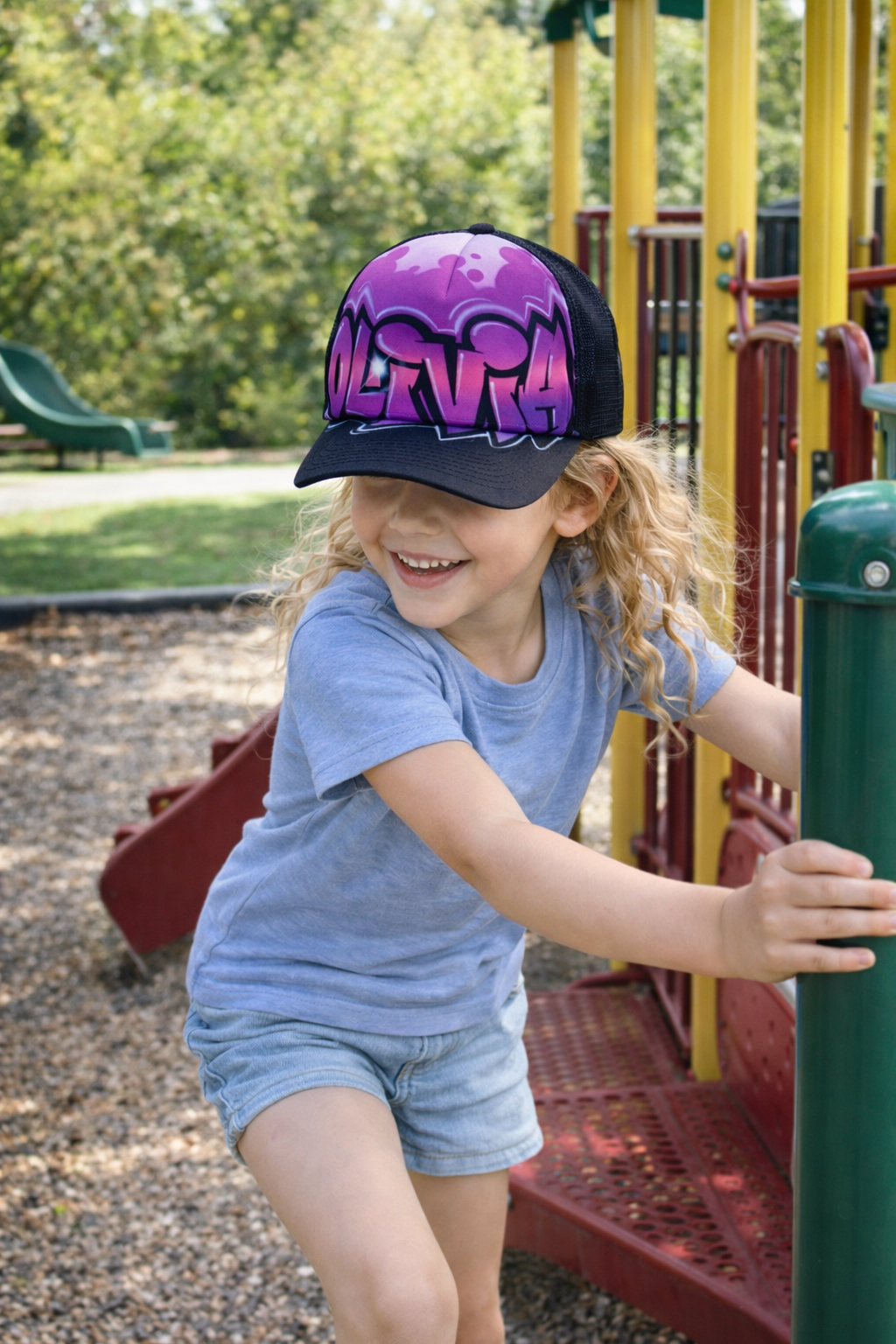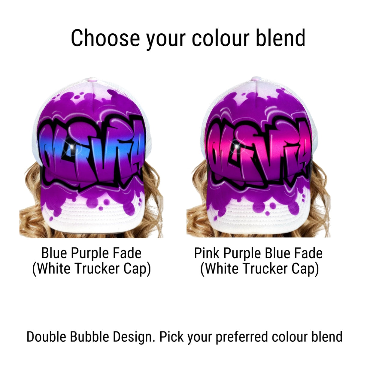 Each cap is individually painted in our studio using the exact Double Bubble Style shown above. Your child's name replaces the example name in the same layout and colour blend you choose.