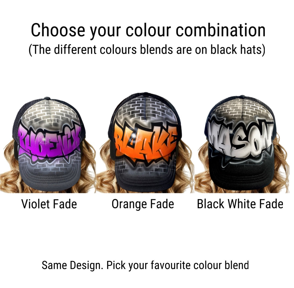 Each cap is individually painted in our studio using the exact style shown above. Your name or your child's name replaces the example name in the same layout and colour blend you choose.